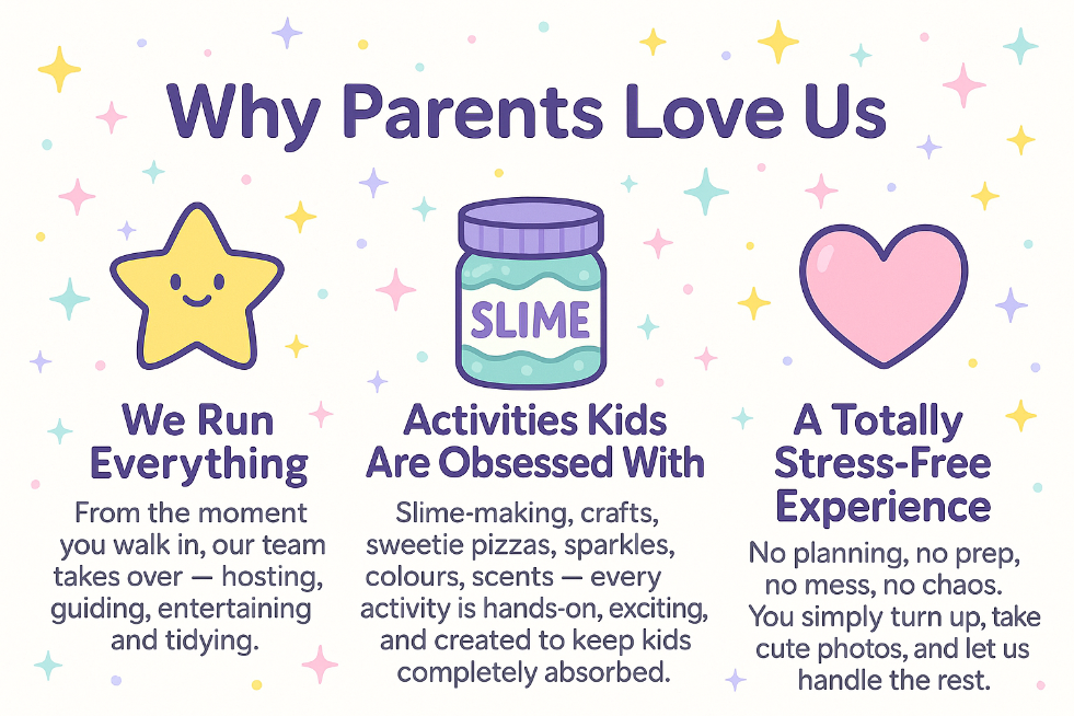 Our parties are creative, energetic and wonderfully stress-free β the kind children talk about long after the last slime pot is packed away.
