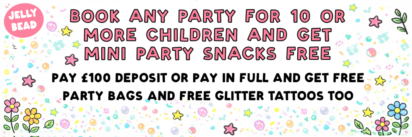 Looking for something extra magical (or budget-friendly)? Weβve put together a few sparkly party bundles to help you get the most out of your Jelly Bead celebration β including slime, pizza, weekday deals and more.